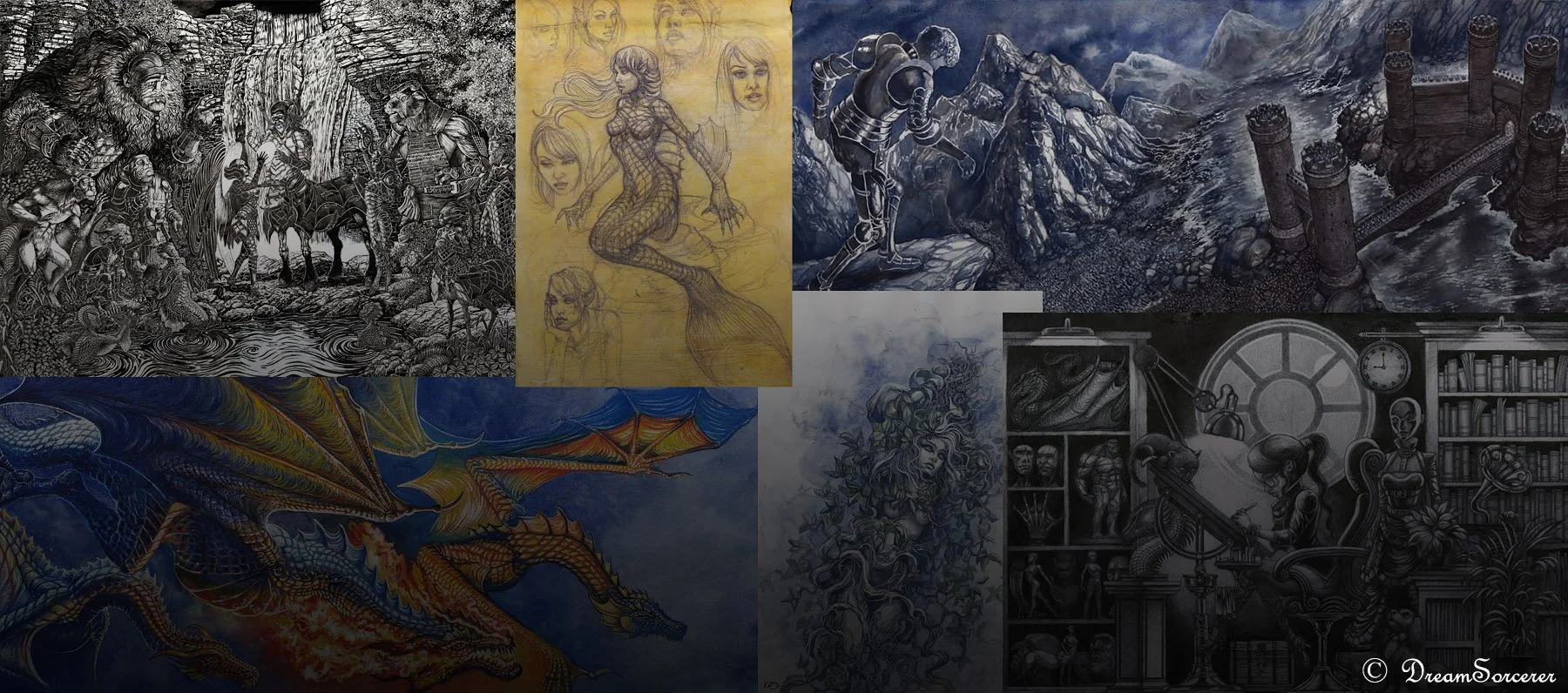 A collection of finished illustrations, using pencil, inks, watercolour and fineliners.